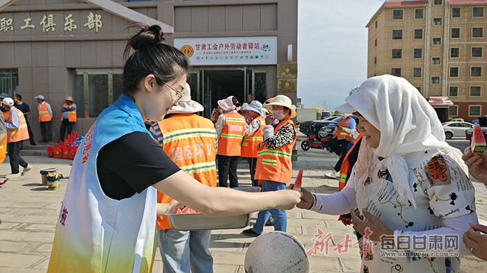 每日甘肃网讯 为切实做好高温季节一线户外劳动者防暑降温工作,进一步维护广大劳动者健康权益,7月14日,民乐县总工会“夏送清凉”慰问活动拉开序幕,为奋战在高温一线的职工以及新业态户外劳动者送上西瓜、矿泉水、酸奶等清凉物资。